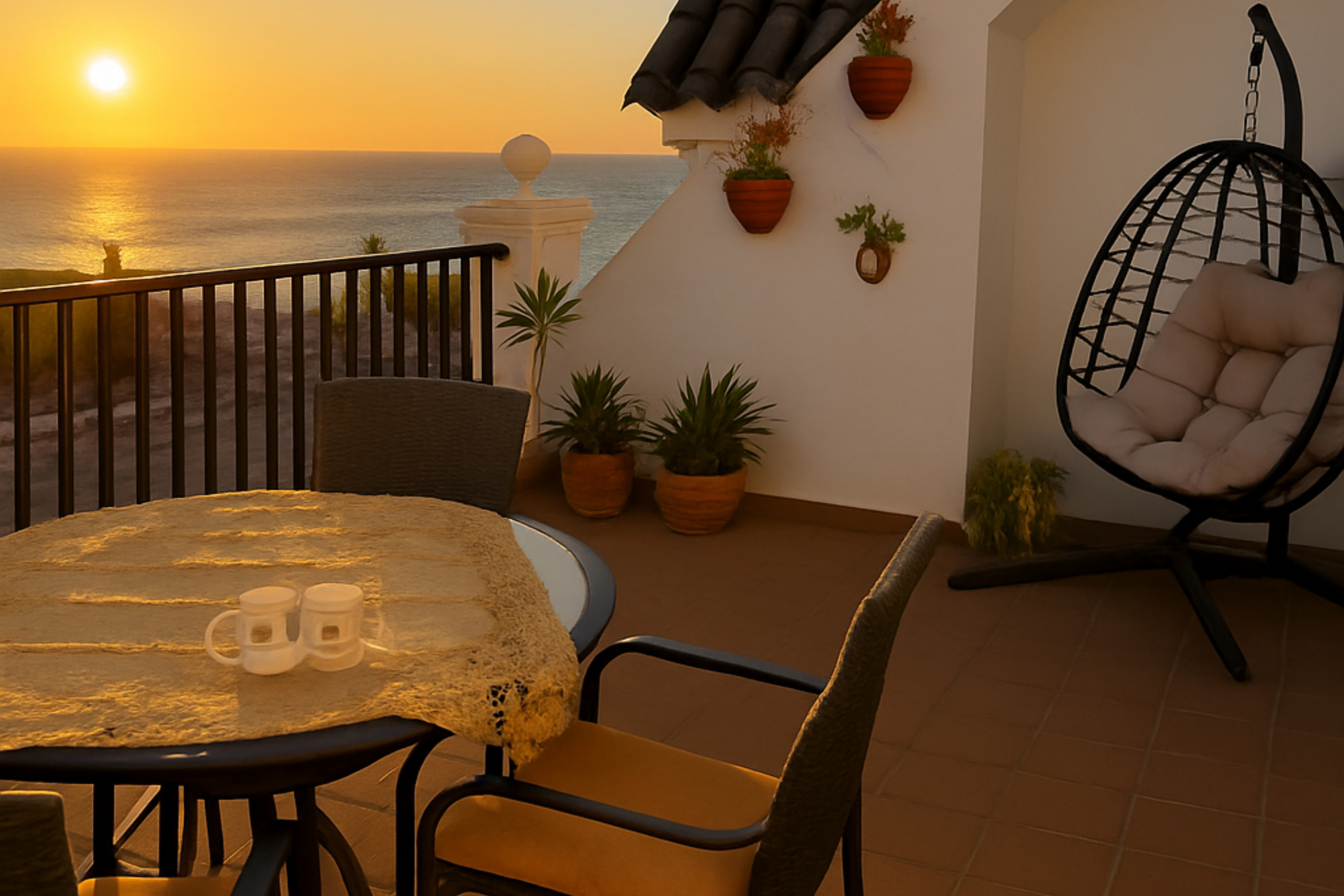 Détendez-vous sur la terrasse privée de 20 m² avec vue sur l'océan et les montagnes - jouez de la guitare espagnole ou détendez-vous avec notre collection de livres, magazines et DVD. Une chaise œuf douillette et une barre de son complètent l'expérience.